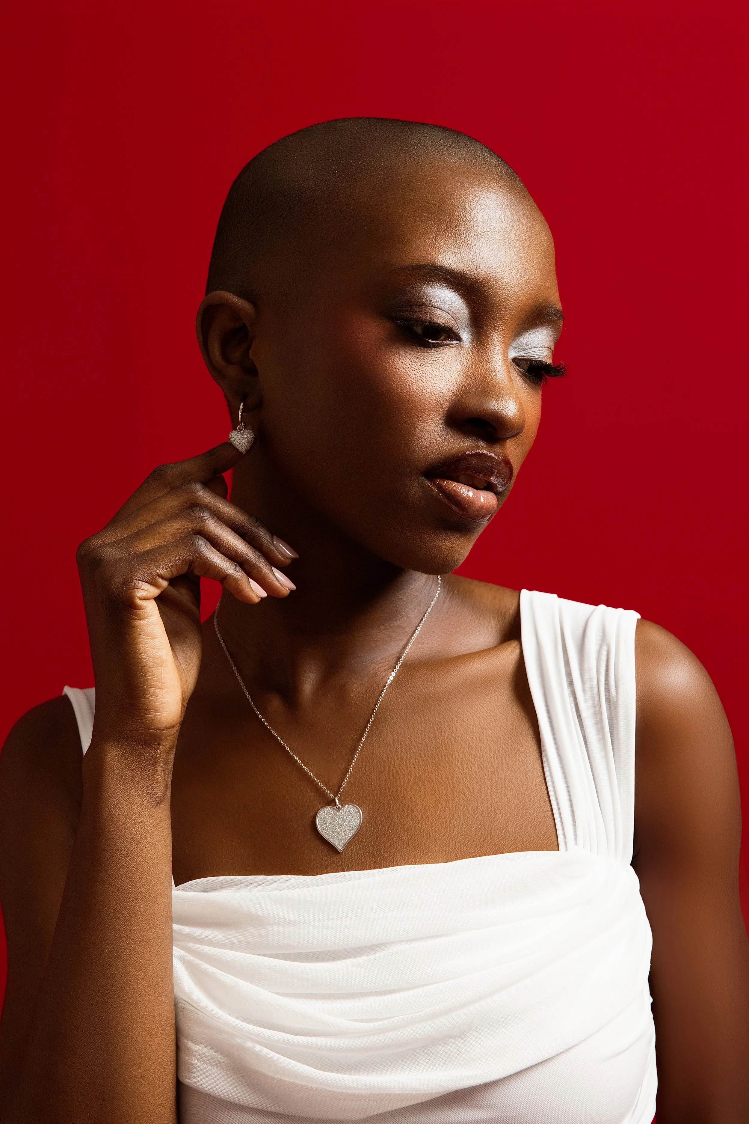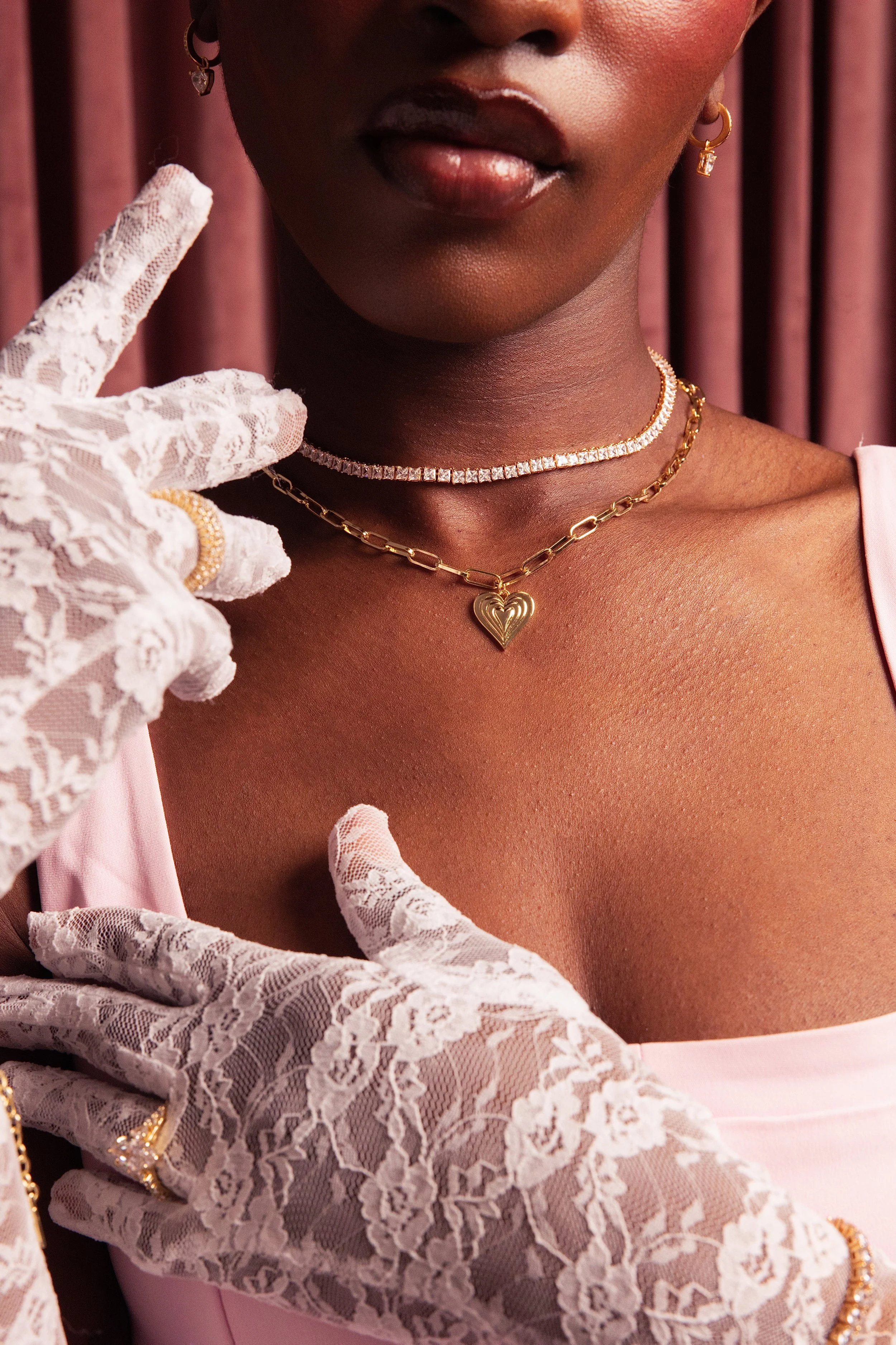 Rather than relying on a standard backdrop, I envisioned a dimensional heart installation layered in rich pink velvet draping — a sculptural set piece that would frame the jewelry without overpowering it.